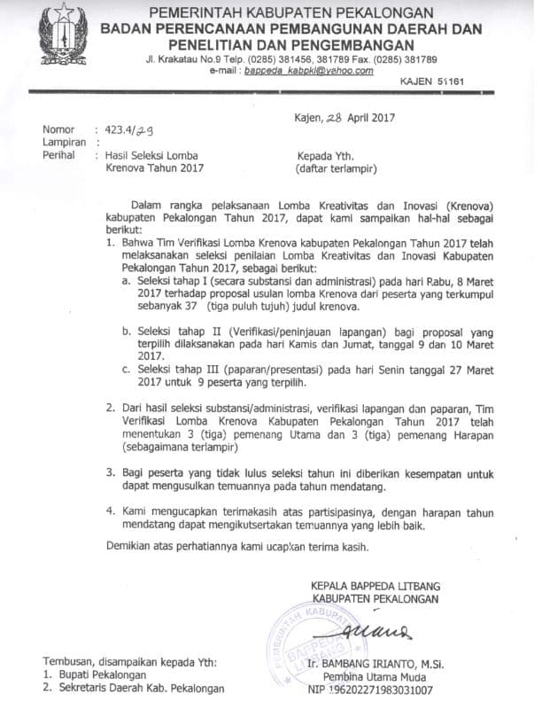 Hasil Seleksi Lomba Krenova Tahun 2017